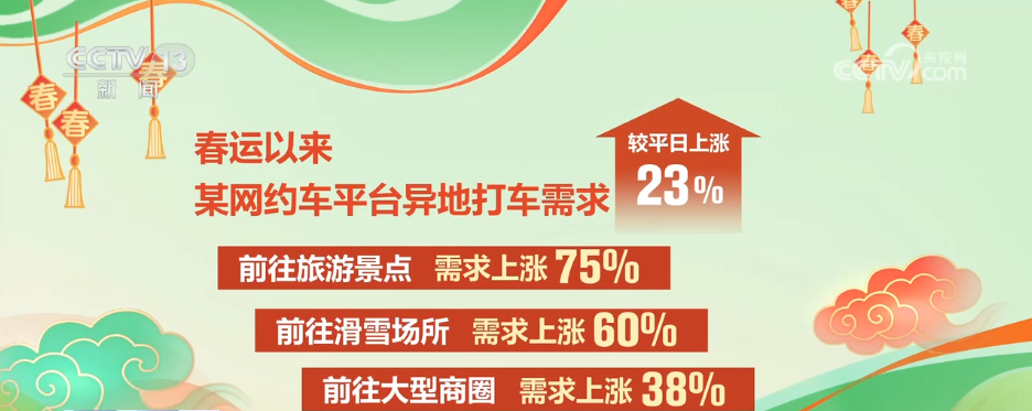道路出行方面,短途异地出行,打车需求旺盛。某网约车平台异地打车需求较平日上涨23%,其中前往旅游景点、滑雪场所和大型商圈的需求分别上涨75%、60%和38%。