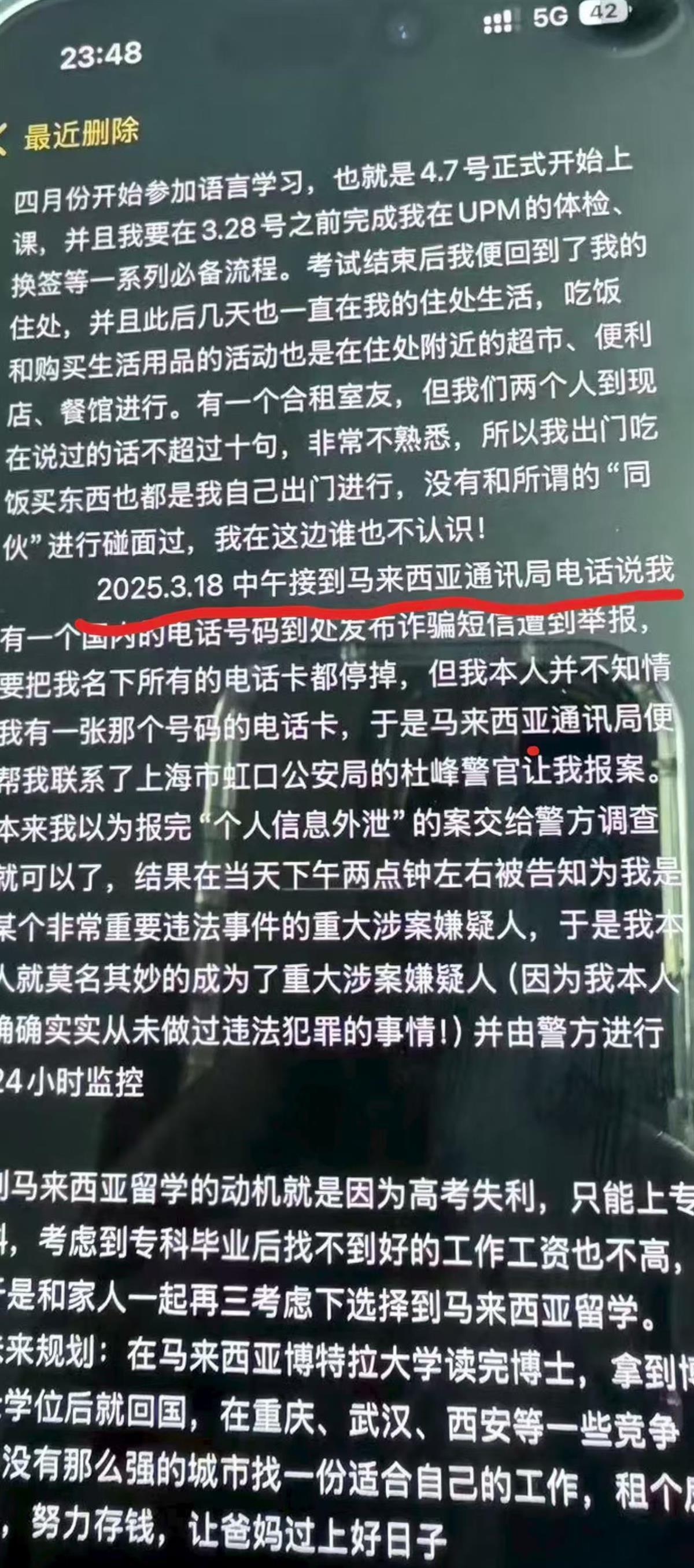 次日,李先生等人赶到吉隆坡,为小文料理后事,前后花了半个月时间。李先生从女儿的手机备忘录里发现的一篇文章,这篇文章以小文的口吻写道:3月18日中午,接到“马来西亚通讯局”电话,说我有一个国内的电话号码到处发布诈骗短信遭到举报,要把我名下所有的电话卡都停掉,但我本人并不知情我有一张那个号码的电话卡,于是“马来西亚通讯局”便帮我联系了“上海市虹口公安局”的“杜峰警官”……文中还有“由‘警方’进行24小时监控”的表述。