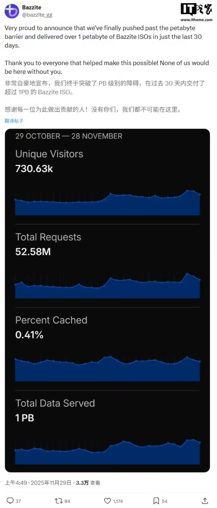根据 Bazzite 团队公布的信息,从 10 月 29 日到 11 月 28 日,该项目网站获得 73 万独立访问者,并首次在单月内传输 1PB 数据。