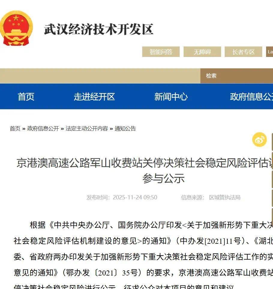 极目新闻记者注意到,针对军山收费站关停决策,武汉经开区于11月24日9时50分,在武汉经开区官网上进行了公示,公示时间从2025年11月24日至2025年12月5日(共10个工作日),广泛征求社会各界意见。公众可在公示时间内,以电话、邮件等方式向评估单位反馈意见或建议。